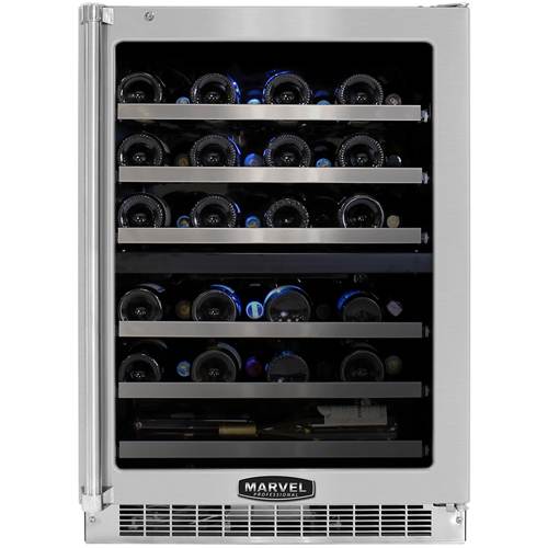 Keep your collection of wines safe and chilled when you keep them in the Marvel Professional 24 Inch Dual Zone Wine Cellar with Glass Door (MPRO6DZE-BS-LR, MPRO6DZE-BS-LL). This wine cellar features six (6) glide out wine racks that can hold up to 44 standard size bottles, and the two (2) dual temperature zones enable you to hold both red and white wines at separate temperatures for easier storage. Each temperature zone features a separate temperature display that enables you to adjust and maintain the temperature in each zone between 40 and 65 degrees F. The stainless steel design of the door and wine racks add a modern and professional look to your kitchen, game room, or anywhere else, and the grille at the bottom allows you to build it into your cabinetry to blend wit the design or motif of the room. A dual-pane, tinted glass door enables you to hold your wine collection without worrying that UV rays will disturb your wines, as the glass door prevents UV from destroying the quality of your collection. A close door assist hinging system ensures that the door will close by itself, even when left open accidentally. Ideal for the collector or connoisseur, this wine cellar will keep your collection chilled and ready to serve. LED Interior Lighting: The soft blue LED lighting keeps your collection highlighted while ensuring that the wines won't be overexposed to light Door Lock: The wine cellar door comes standard with a door lock to keep your collection safe and secure from thieves Dual Temperature Zones: Two (2) independently adjustable temperature zones allow you to store red and white wines at separate temperatures for optimal taste